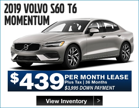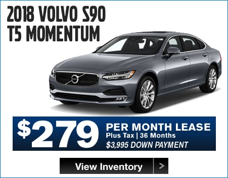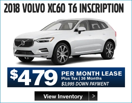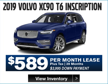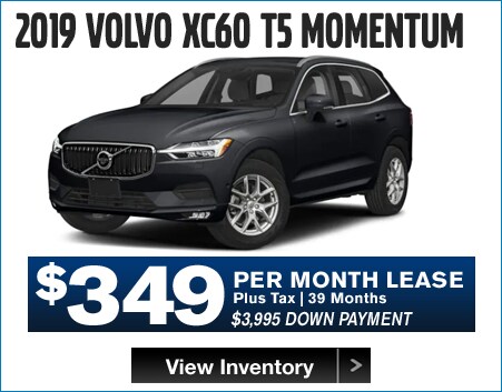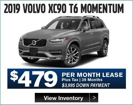 2018 S90 T5 MOMENTUM MSRP $57,305, $3,300 cash cap reduction. 2019 XC60 T5 MOMENTUM MSRP $43,400, $3,750 cash cap reduction. 2019 S60 T6 MOMENTUM MSRP $46,410, $3,300 cash cap reduction. 2019 XC90 T6 MOMENTUM MSRP $59,705, $4,400 cash cap reduction. 2018 XC60 T6 INSCRIPTION MSRP $59,755. $3,750 cash cap reduction. XC90 T6 INSCRIPTION MSRP $65,900, $4,400 cash cap reduction. All payments include available rebates from Volvo. 36 months. 7,500 miles per year on all leases. Lease down payment plus acquisition fee, 1st payment, documentation fee, registration and taxes. All leases are 39 months except 2018 XC60, 2018 S90, and 2019 S60 which are 36 months. Lessee is responsible for excess wear and mileage over 7,500 miles/year at $0.25/mile. No security deposit required. Includes destination charge. Offers shown include all applicable Volvo allowances/incentives, available only through Volvo Car Financial Services on approved credit. All offers include Loyalty incentive. Not all customers will qualify for all Volvo allowances/incentives. Lease and financing offers exclude applicable taxes, title, acquisition and registration fees and are available for qualified customers based on FICO score through Volvo Car Financial Services. Valid on in-stock vehicles only. Cannot be combined with any other offer. Not valid on previous purchases. Vehicle pictures are for illustrative purposes only. Offer expires 1/31/2019.