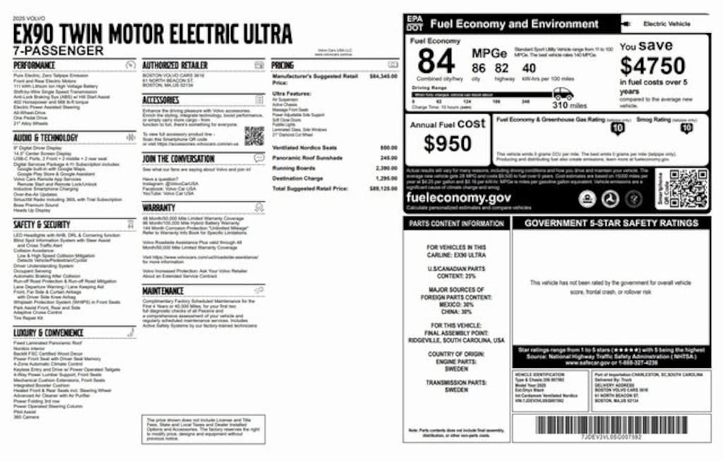 Bernardi Volvo Cars Natick is pleased to offer this 2025 Volvo EX90 Twin Motor Ultra 7 Seater